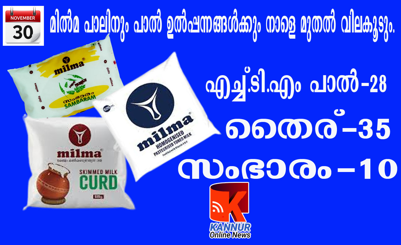 തളിപ്പറമ്പ്: മില്മ പാലിനും പാല് ഉല്പ്പന്നങ്ങള്ക്കും നാളെ മുതല് വിലകൂടും.