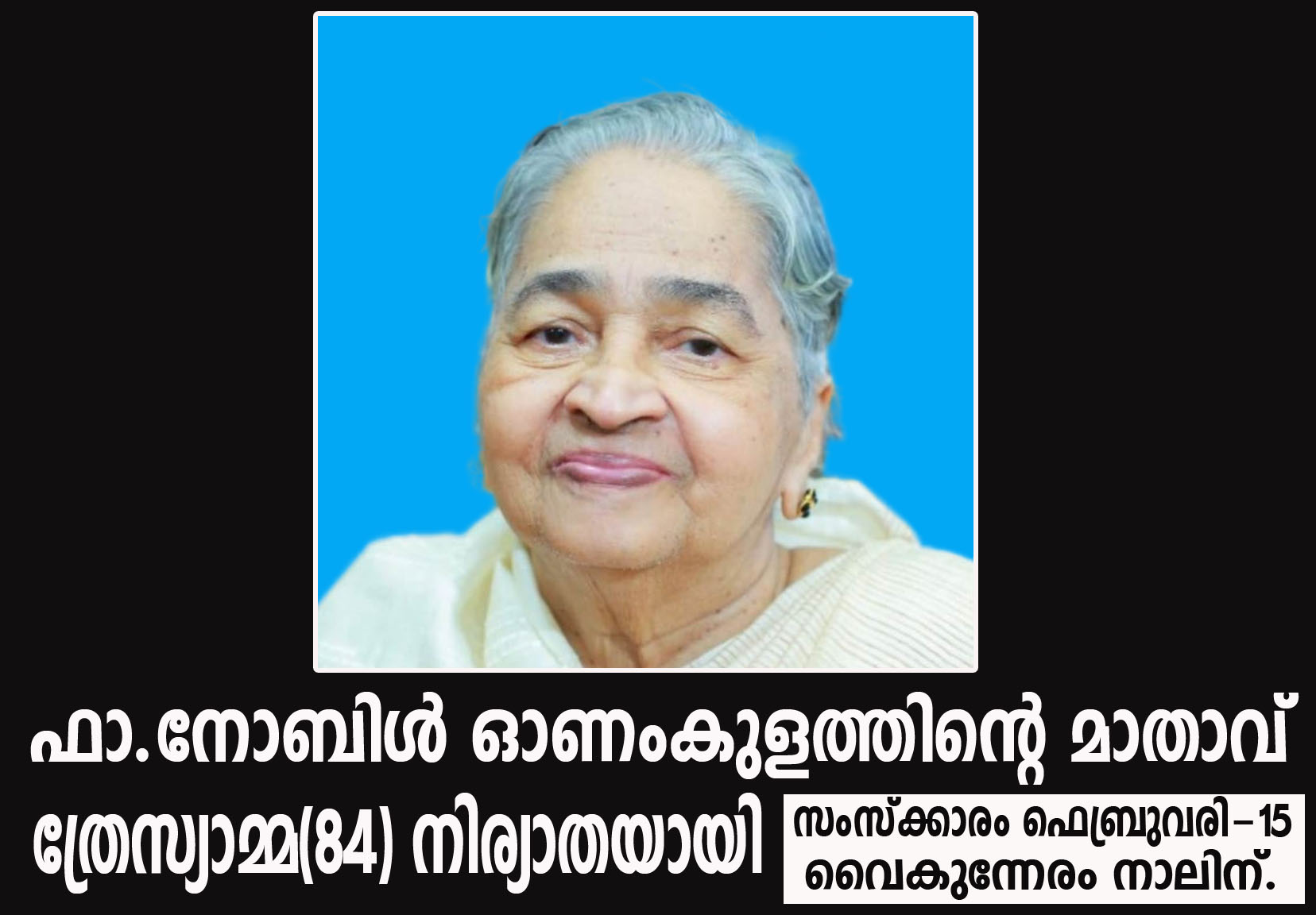ഫാ.നോബിള്‍ ഓണംകുളത്തിന്റെ മാതാവ് ത്രേസ്യാമ്മ(84) നിര്യാതയായി