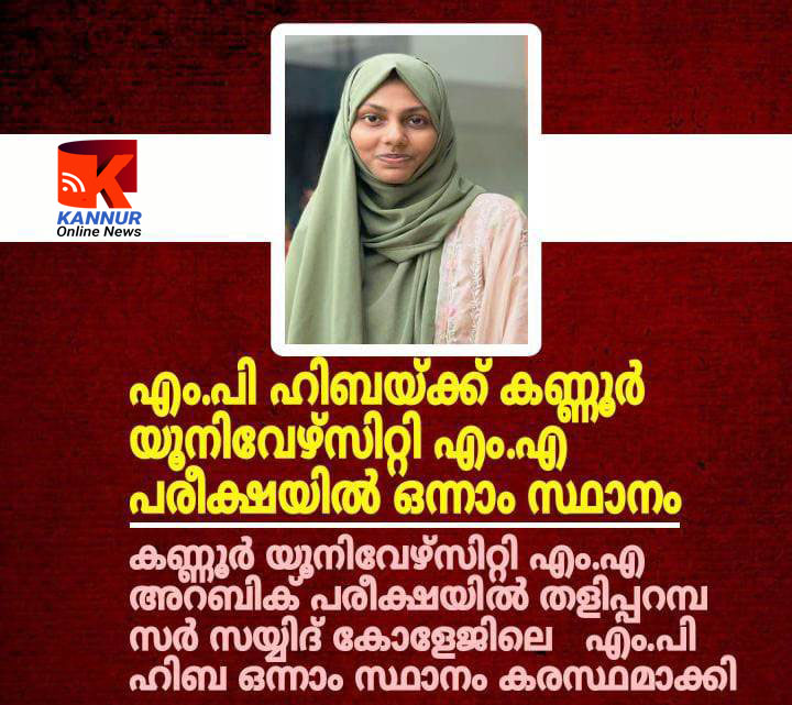 തളിപ്പറമ്പ:കണ്ണൂർ യൂനിവേഴ്സിറ്റി എം.എ അറബിക് പരീക്ഷയിൽ തളിപ്പറമ്പ സർ സയ്യിദ് കോളേജിലെ എം.പി ഹിബയ്ക്ക് ഒന്നാം സ്ഥാനം.