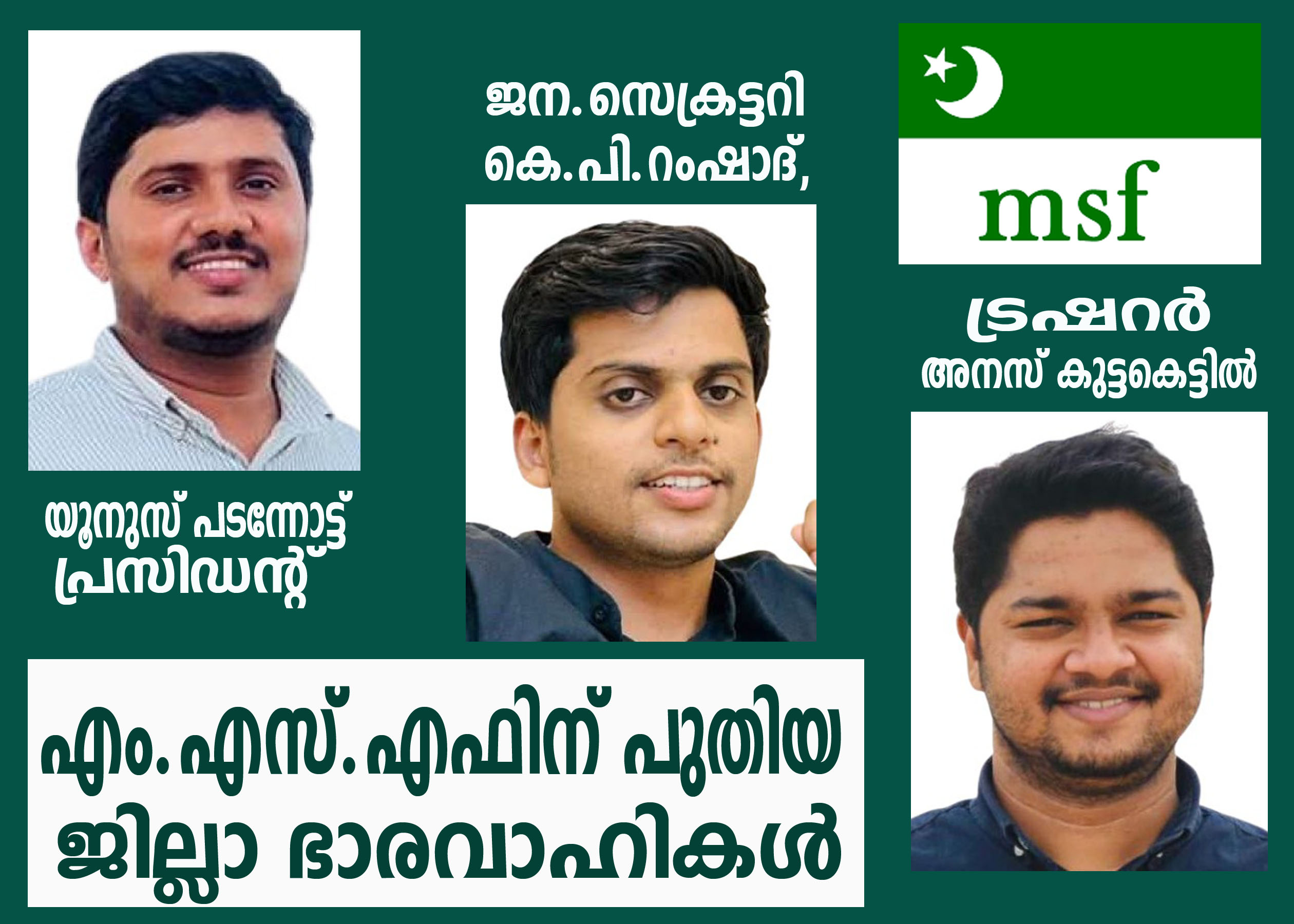 ജില്ലാ എം എസ് എഫ് ഭാരവാഹികളായി പ്രസിഡന്റ് യൂനുസ് പടന്നോട്ട്, ജന.സെക്രട്ടറി കെ.പി.റംഷാദ്, ട്രഷറര് അനസ് കുട്ടകെട്ടില്
