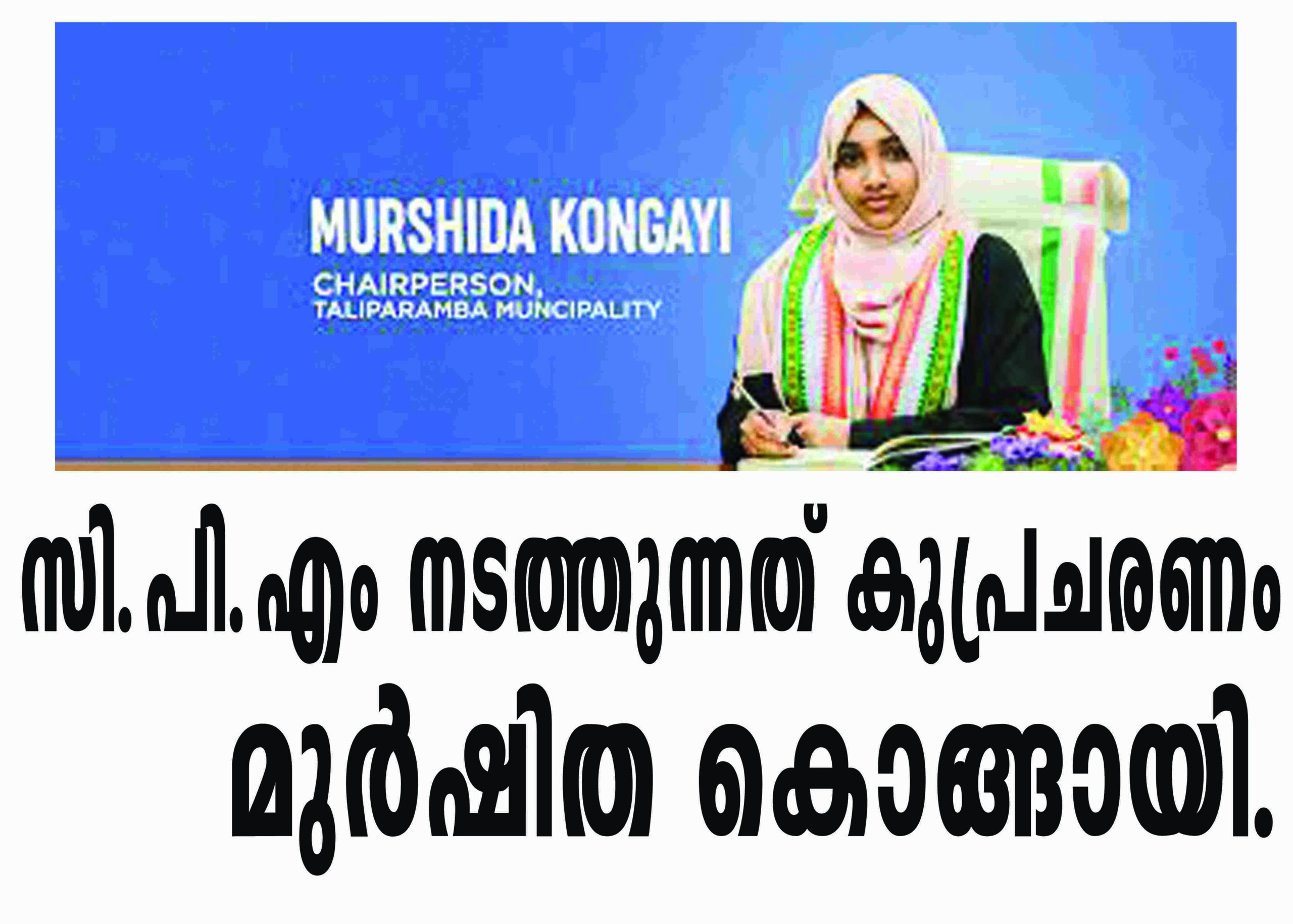 തളിപ്പറമ്പ്: നഗരസഭയ്ക്ക് ഒരു രൂപയുടെ പോലും സാമ്പത്തികബാധ്യതയില്ലാതെ നടത്തുന്ന വിപുലമായ സൗന്ദര്യവല്‍ക്കരണ പ്രവര്‍ത്തനങ്ങളില്‍ സിപിഎം അഴിമതി ആരോപിക്കുന്നത് എം.എല്‍.എ ഫണ്ട് ഉപയോഗപ്പെടുത്തി നഗരത്തില്‍ നടത്തുന്ന സൗന്ദര്യവല്‍ക്കരണ പദ്ധതികളിലെ അഴിമതിയും ക്രമക്കേടും മൂടിവെക്കാന്‍ വേണ്ടിയാണെന്ന് നഗരസഭാ ചെയര്‍പേഴ്‌സണ്‍ മുര്‍ഷിദ കൊങ്ങായി ആരോപിച്ചു.