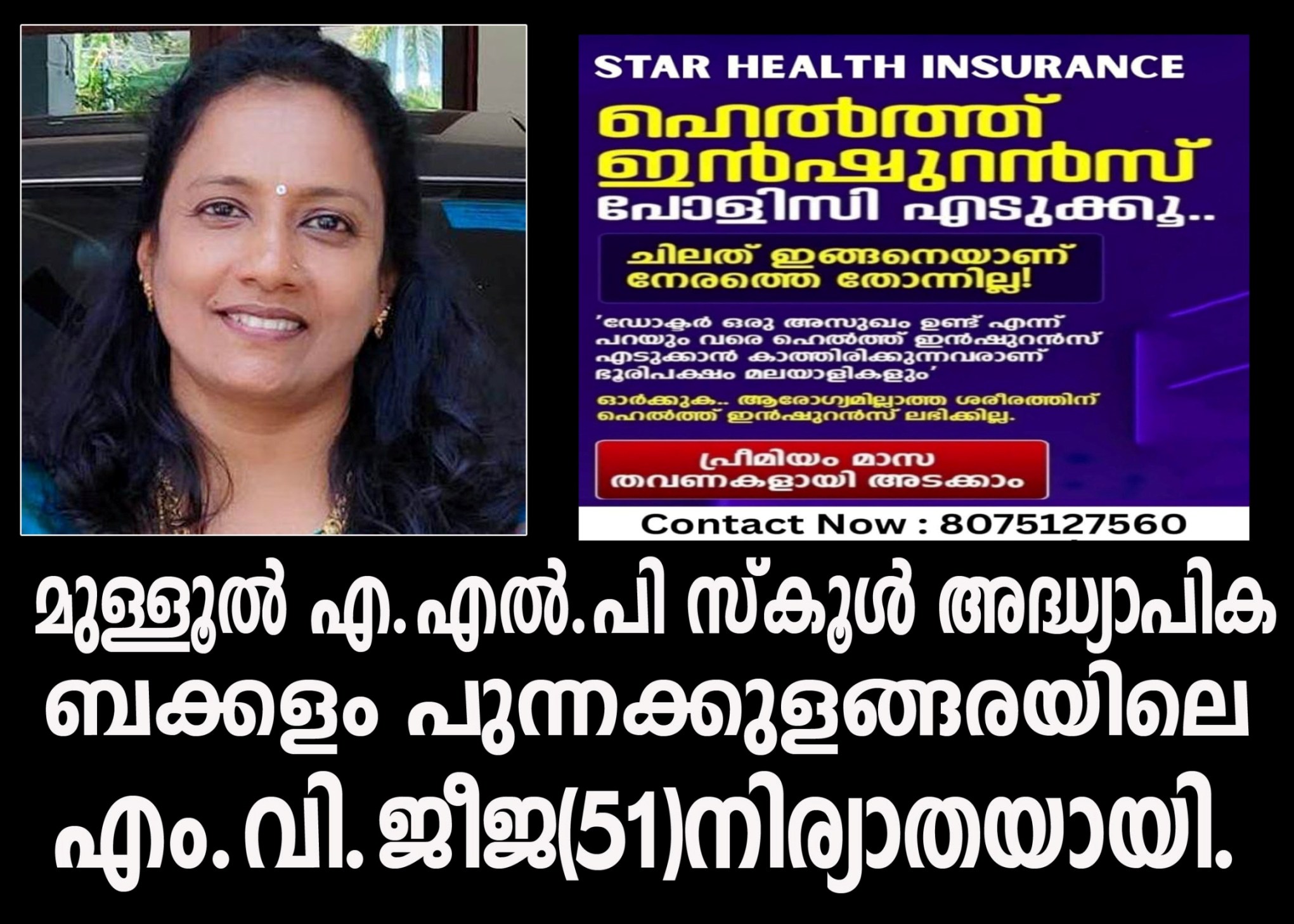 തളിപ്പറമ്പ്: മുള്ളൂല് എ.എല്.പി സ്കൂള് അദ്ധ്യാപിക ബക്കളം പുന്നക്കുളങ്ങരയിലെ എം.വി.ജീജ(51)നിര്യാതയായി.