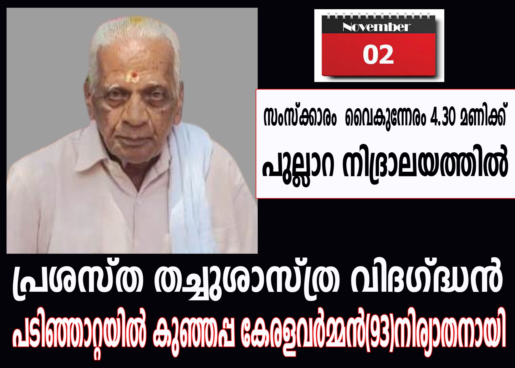 പ്രശസ്ത തച്ചുശാസ്ത്ര വിദഗ്ദ്ധന് എരമം സൗത്തിലെ പടിഞ്ഞാറ്റയില് കുഞ്ഞപ്പ കേരളവര്മ്മന്(93)നിര്യാതനായി.
