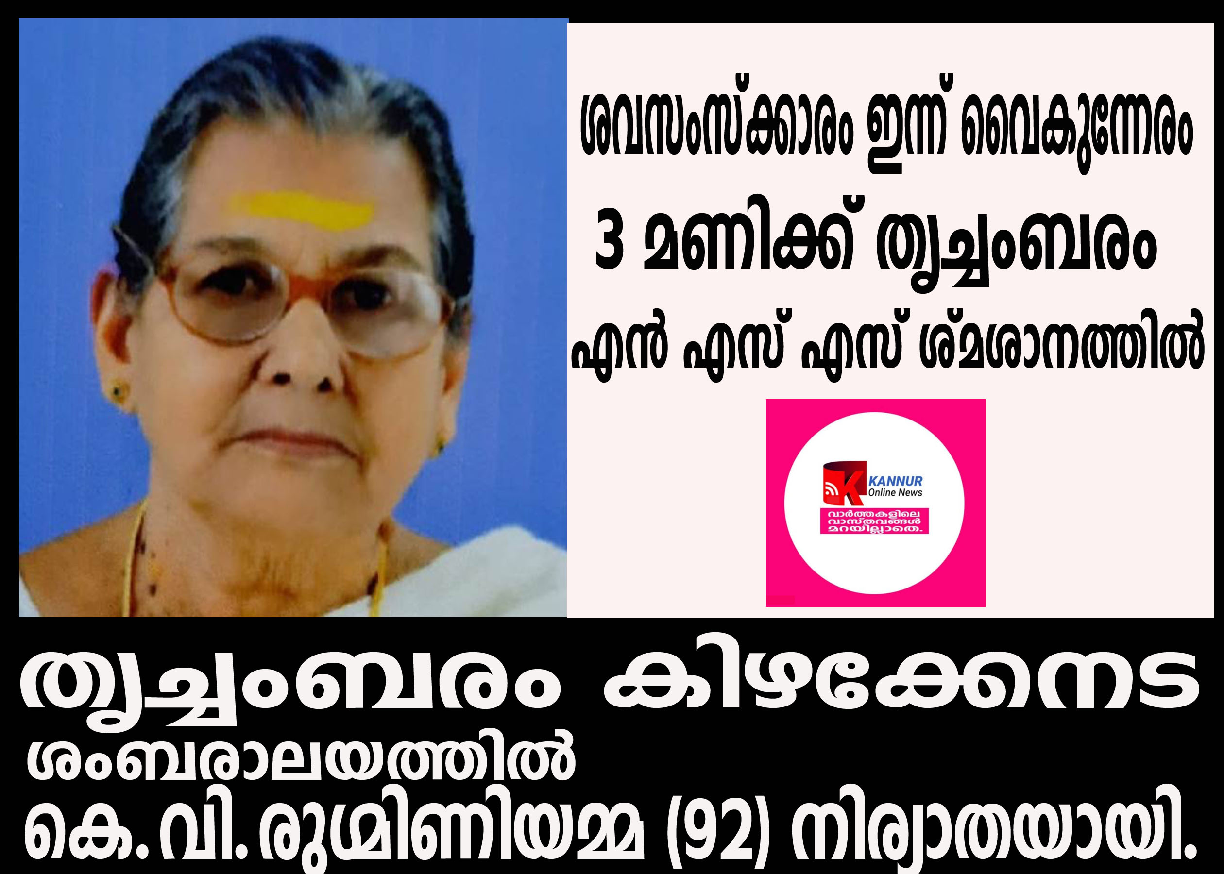 തളിപ്പറമ്പ്: തൃച്ചംബരം കിഴക്കേ നടയില് ശംബരാലയത്തില് പരേതനായ മുണ്ടയാടാന് കൃഷ്ണന് നമ്പ്യാരുടെ ഭാര്യ കാരോത്ത് വീട്ടില് കെ.വി.രുഗ്മിണിയമ്മ (92) നിര്യാതയായി.