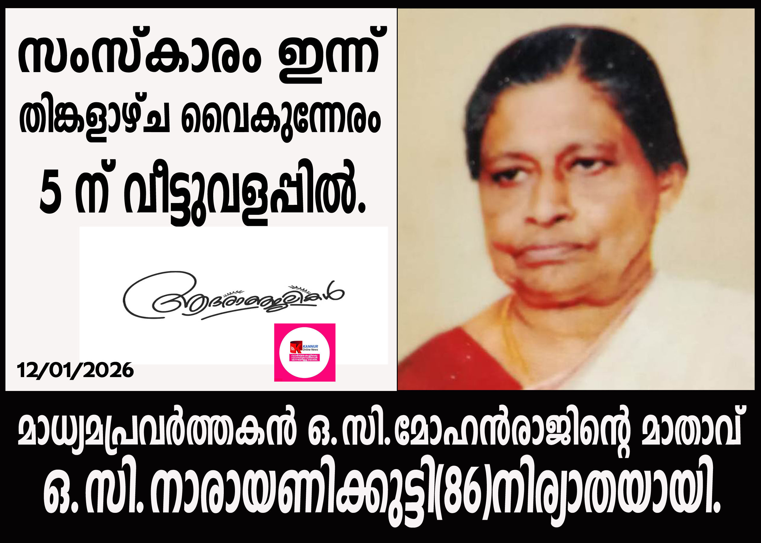 സംസ്കാരം ഇന്ന് തിങ്കളാഴ്ച വൈകുന്നേരം 5 ന് വീട്ടുവളപ്പില്.