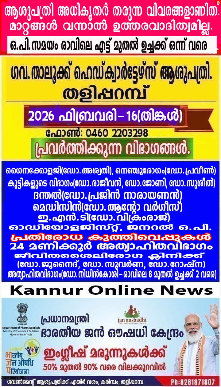 അത്യാഹിതവിഭാഗം(ഡോ.നിധിന്കോശി-രാവിലെ 8 മുതല് ഉച്ചക്ക് 2 വരെ)