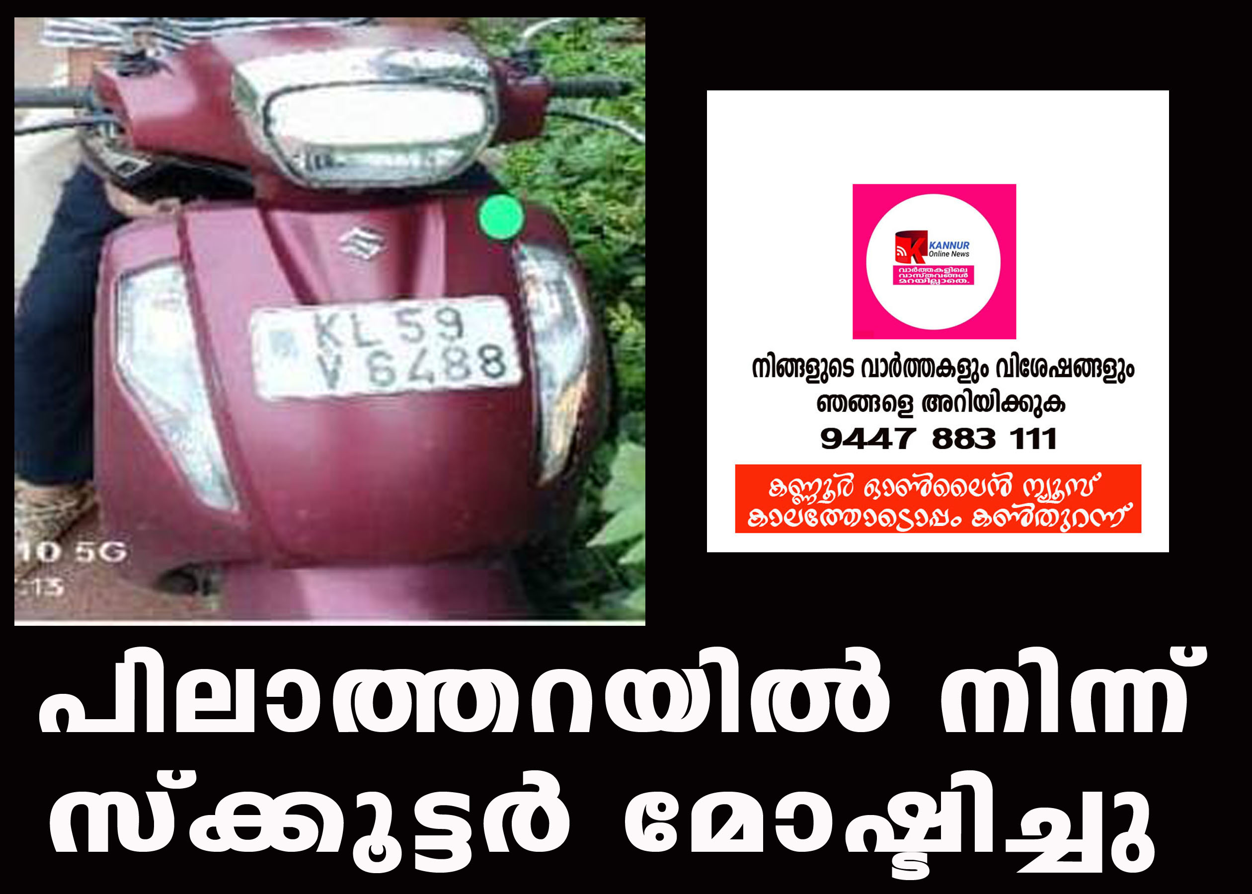 രാമന്തളി പാലക്കോട് കാരമുട്ടത്തെ സല്‍മത്ത് മന്‍സിലില്‍ എന്‍.പി.മിഖ്ദാദിന്റെ 2020 മോഡല്‍ കെ.എല്‍-59 വി-6488 മെറൂണ്‍സിറത്തിലുള്ള ആക്‌സസ് 125 സ്‌ക്കൂട്ടറാണ് കാണാതായത്.