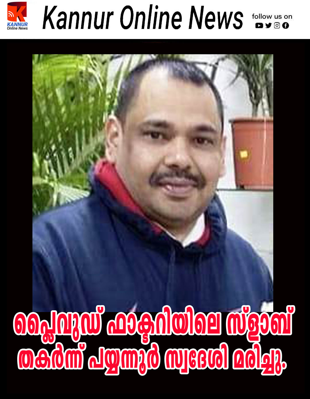 പ്ലൈവുഡ് ഫാക്ടറിയിലെ സ്ളാബ് തകര്ന്ന് പയ്യന്നൂര് സ്വദേശി മരിച്ചു.