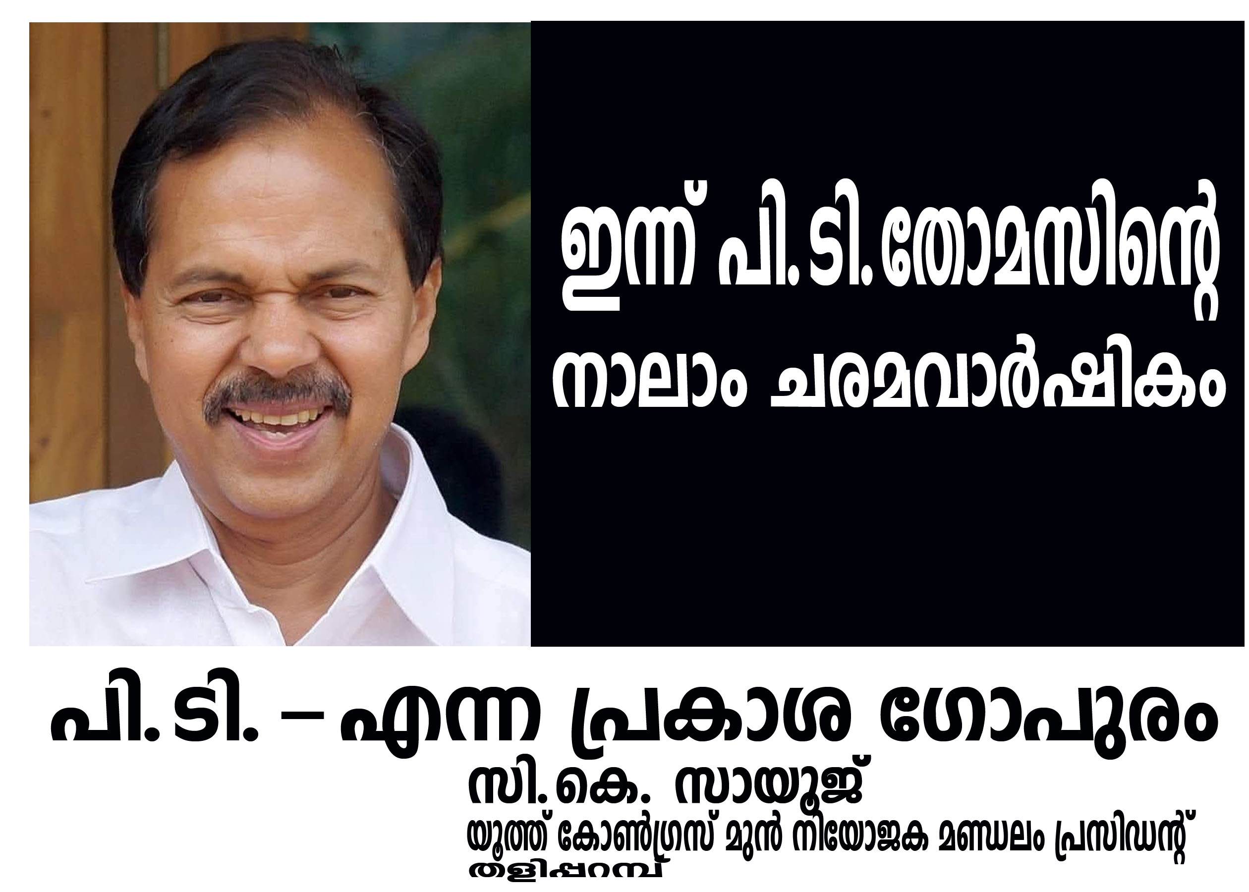 കേരള രാഷ്ട്രീയത്തില് സ്വന്തമായ നിലപാടുകള് കൊണ്ടും, സവിശേഷമായ വ്യക്തിത്വം കൊണ്ടും പുതിയ രാഷ്ട്രീയ സംസ്കാരം രൂപപ്പെടുത്തിയ രാഷ്ട്രീയ നേതാവായിരുന്നു ‘പി.ടി.’ എന്ന രണ്ടക്ഷരത്താല് രാജ്യമൊട്ടാകെ അറിയപ്പെട്ടിരുന്ന ‘പി.ടി. തോമസ്’. ഞങ്ങളുടെ തലമുറിയുടെ വഴി കാട്ടിയായിരുന്ന