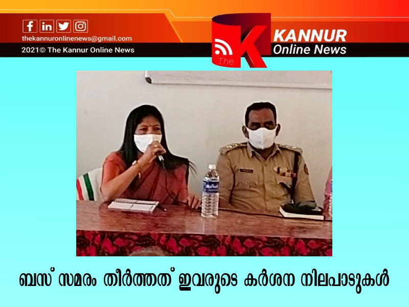 തളിപ്പറമ്പ്: തളിപ്പറമ്പ് ആര്.ഡി.ഒ ഇ.പി.മേഴ്സിയുടെ സന്ദര്ഭോചിതമായ ഇടപെടലും പയ്യന്നൂര് ഡി.വൈ.എസ്.പി കെ.ഇ.പ്രേമചന്ദ്രന് എടുത്ത യുക്തിസഹവും കര്ശനമായ നിലപാടുകളുമാണ് ഇന്നലെ മുതല് നടന്നുവന്ന ബസ്സമരം പിന്വലിക്കാന് കാരണമായത്.