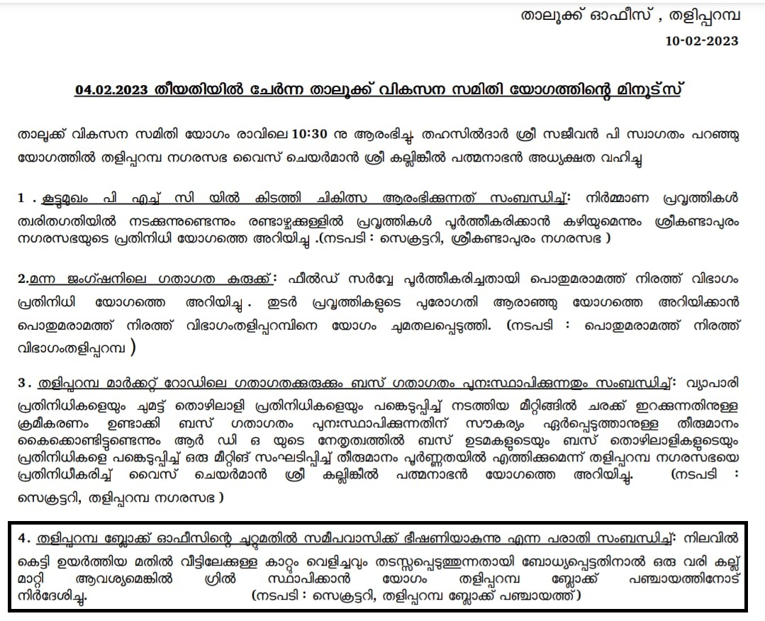 ഇത് സംബന്ധിച്ച് 2023 ഫിബ്രവരി 4 ന് ചേര്ന്ന തളിപ്പറമ്പ് താലൂക്ക് വികസനസമിതിയില് കാര്യങ്ങള് ബോധ്യപ്പെട്ടതിന്റെ അടിസ്ഥാനത്തില് മതിലിന്റെ ഒരു കല്ലിന്റെ ഉയരം കുറക്കണമെന്ന് നിര്ദ്ദേശിച്ചതിനെ വികസനസമിതി അംഗം കൂടിയായ ബ്ലോക്ക് പഞ്ചായത്ത് പ്രസിഡന്റ് സി.എം.കൃഷ്ണന് പരസ്യമായി നിരാകരിച്ചത് വിവാദമായിരുന്നു.