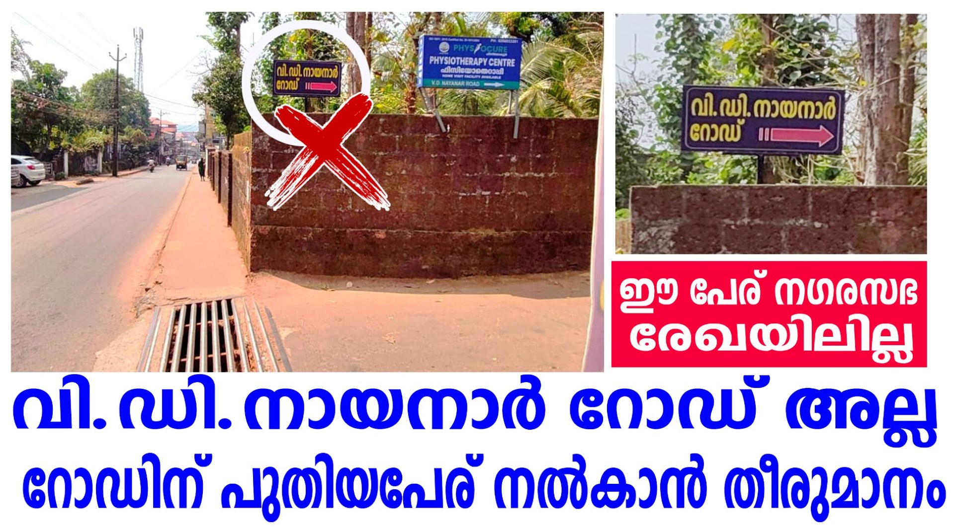 എന്നാല് ഈ റോഡിന് സമീപത്തെ സ്വകാര്യവ്യക്തി തങ്ങളുടെ സ്ഥലത്ത് വി.ഡി.നായനാര് റോഡ് എന്ന് ബോര്ഡ് സ്ഥാപിച്ചിട്ടുണ്ട്.