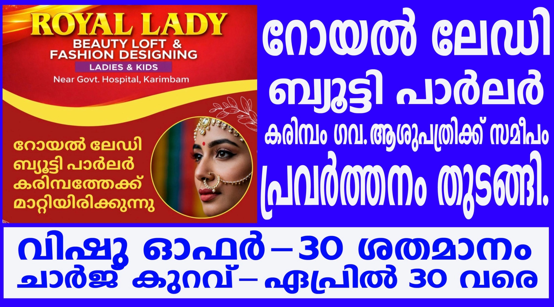 തളിപ്പറമ്പ്: തളിപ്പറമ്പ് ഗവ.താലൂക്ക് ആശുപത്രിക്ക് സമീപം റോയല് ലേഡി ബ്യൂട്ടി പാര്ലര്പ്രവര്ത്തനം തുടങ്ങി.