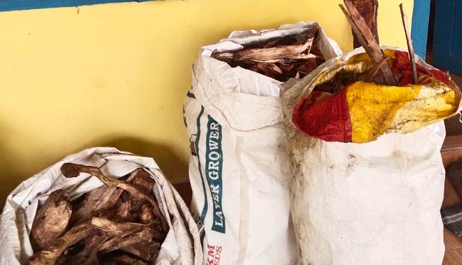 പരിശോധനയില്‍ നാടന്‍ തോക്കും മരം മുറിക്കാന്‍ ഉപയോഗിക്കുന്ന ആയുധവും ഒരു ബാഗും കണ്ടെത്തിയിട്ടുണ്ട്.