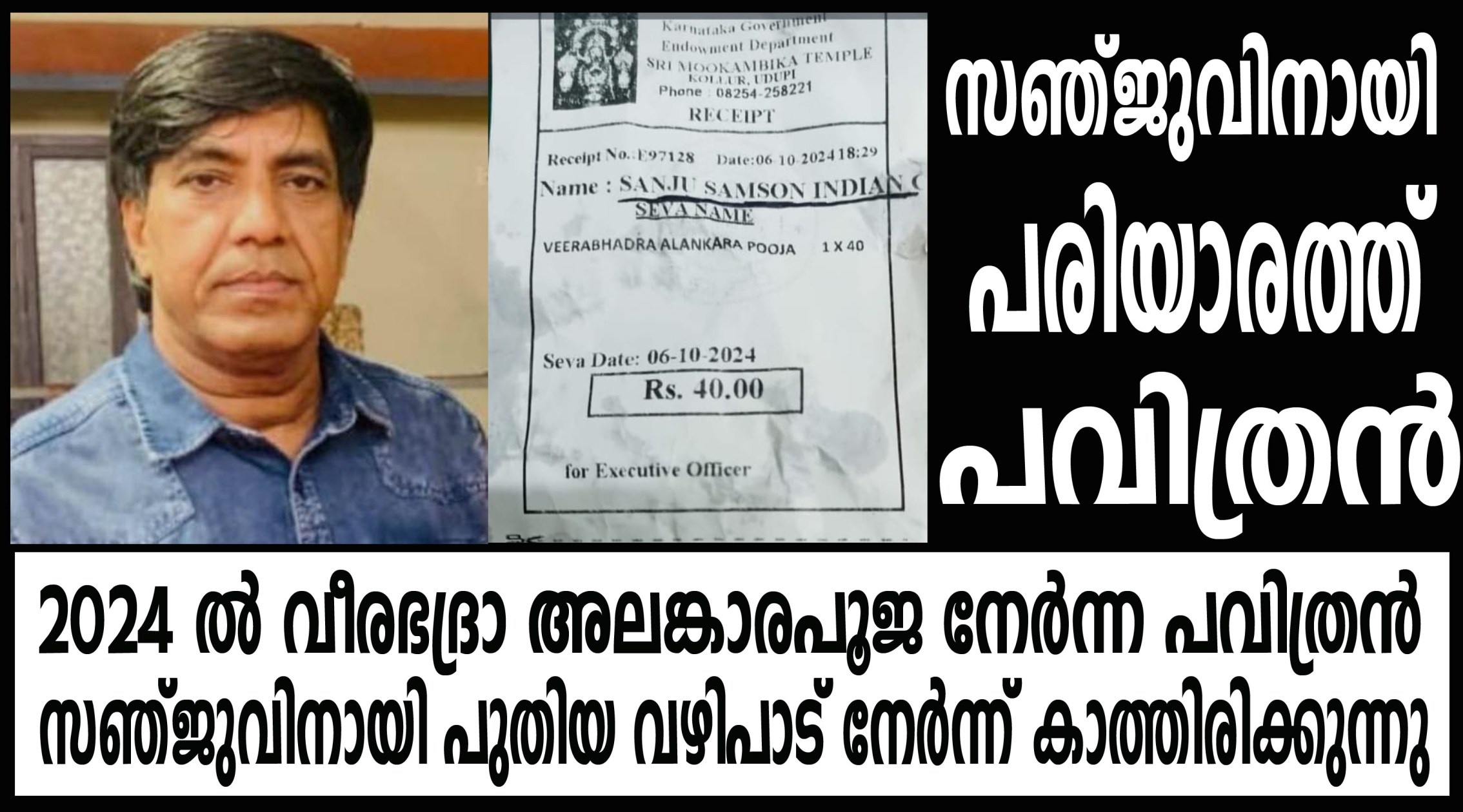 കടുത്ത സഞ്ജു ആരാധകനായ പവിത്രന് 2024 ല് സഞ്ജുവിന് വേണ്ടി വഴിപാട് നേര്ന്ന് പ്രാര്ത്ഥിക്കാന് കൊല്ലൂര് മൂകാംബികയില് പോയിരുന്നു.