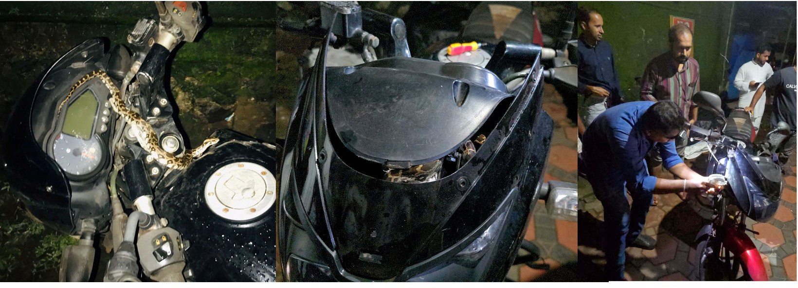ബൈക്കിനകത്ത് കുടുങ്ങിയ പാമ്പിനെ രക്ഷപ്പെടുത്തി.