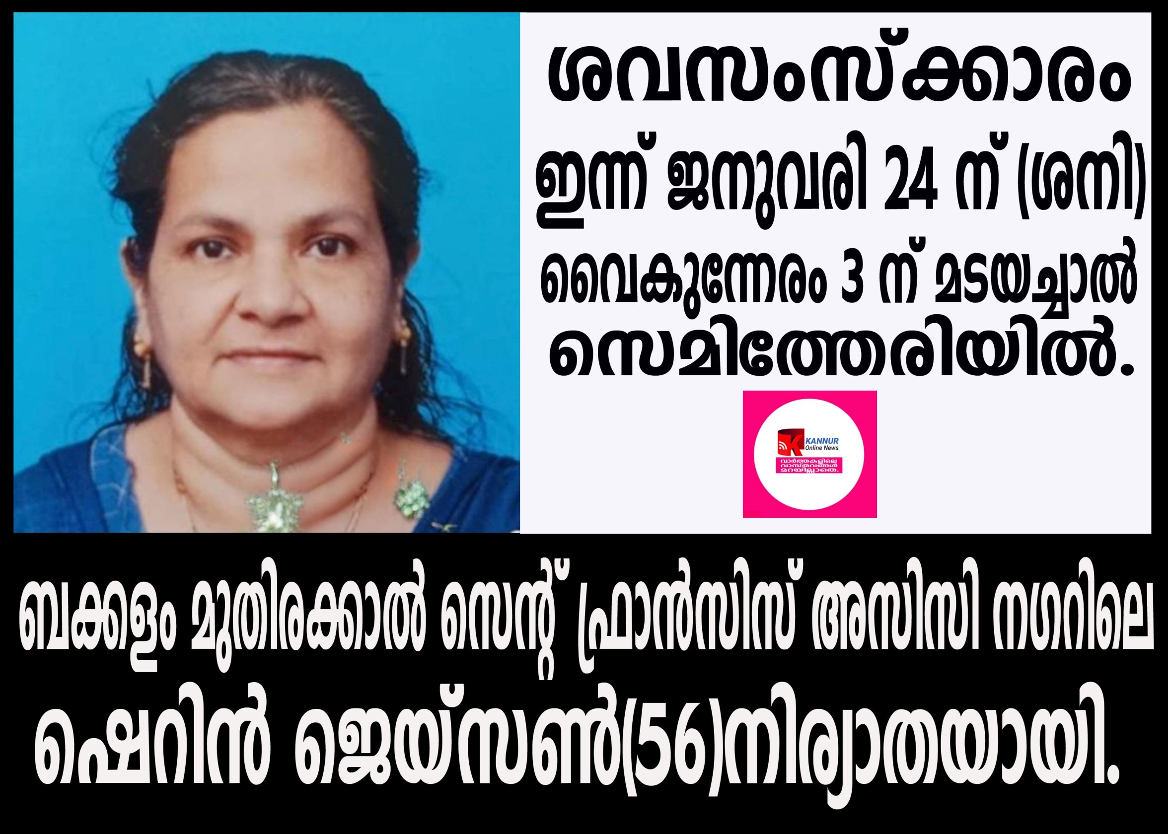 തളിപ്പറമ്പ്: ബക്കളം മുതിരക്കാല് സെന്റ് ഫ്രാന്സിസ് അസിസി നഗറിലെ പരേതനായ എം.ജയ്സന്റെ ഭാര്യ ഷെറിന് ജെയ്സണ്(56)നിര്യാതയായി.