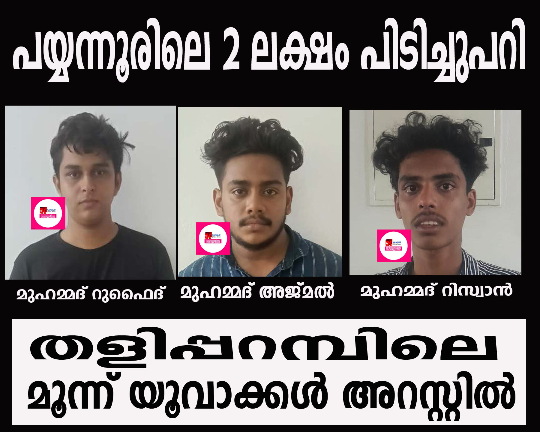 പയ്യന്നൂരിലെ 2 ലക്ഷം പിടിച്ചുപറി തളിപ്പറമ്പിലെ മൂന്ന് യൂവാക്കള് അറസ്റ്റില്
