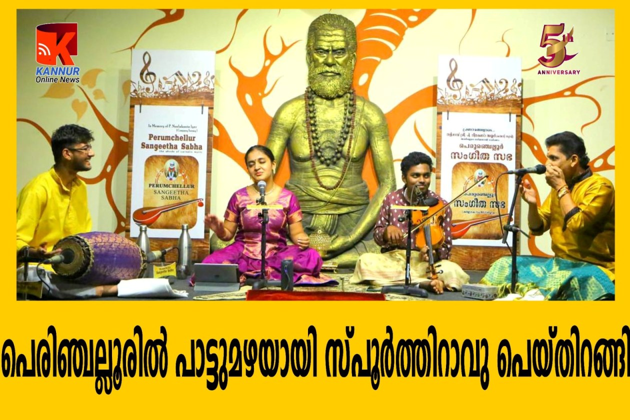 തളിപ്പറമ്പ്: പെരുഞ്ചെല്ലൂര് സംഗീത സഭയുടെ അമ്പത്തി ഒമ്പതാം കച്ചേരിയില് ദ്രുതതാളങ്ങളിലാറാടിച്ച് യുവ കര്ണാടക ഗായിക വിദുഷി സ്പൂര്ത്തി റാവു ഹൃദ്യമായ ഒരു അനുഭവമായി.