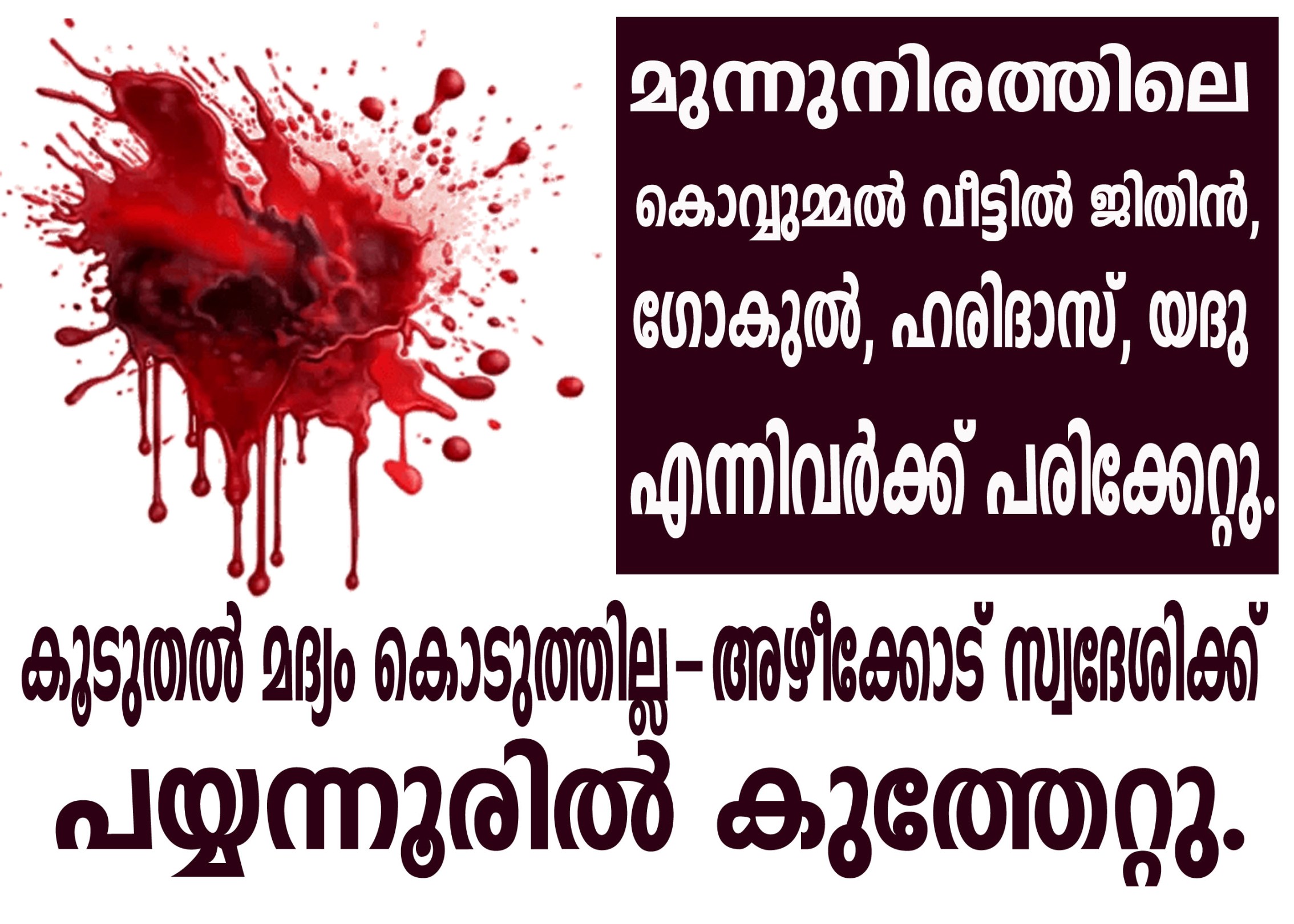 പയ്യന്നൂര്; കൂടുതല് മദ്യം കൊടുക്കാത്ത വിരോധത്തിന് മൂന്നുപേരെ കുത്തിപ്പരിക്കേല്പ്പിക്കുകയും ഒരാളെ മര്ദ്ദിക്കുകയും ചെയ്ത യുവാവിന്റെ പേരില് കേസ്.