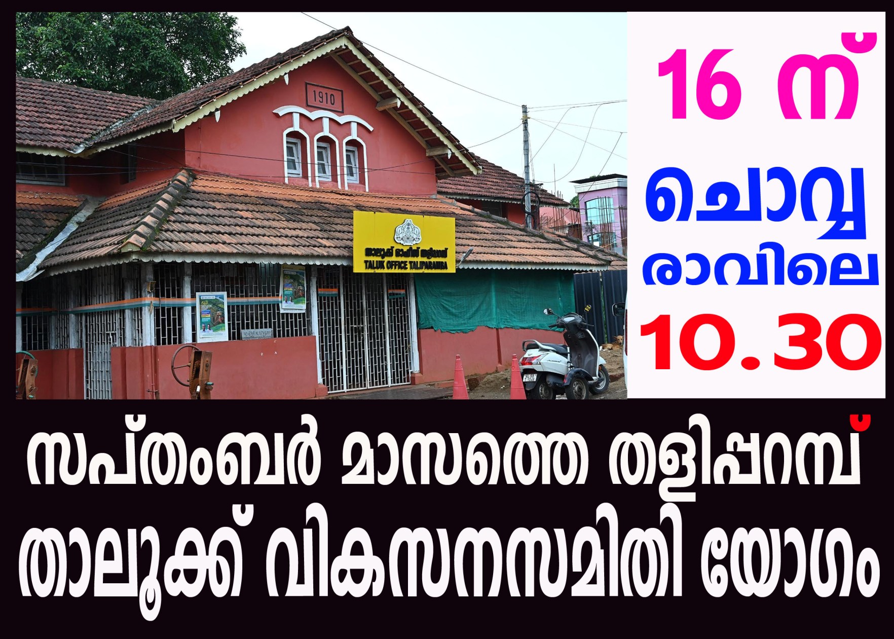 സപ്തംബര് മാസത്തെ തളിപ്പറമ്പ് താലൂക്ക് വികസനസമിതി യോഗം 16 ന് ചൊവ്വാഴ്ച്ച