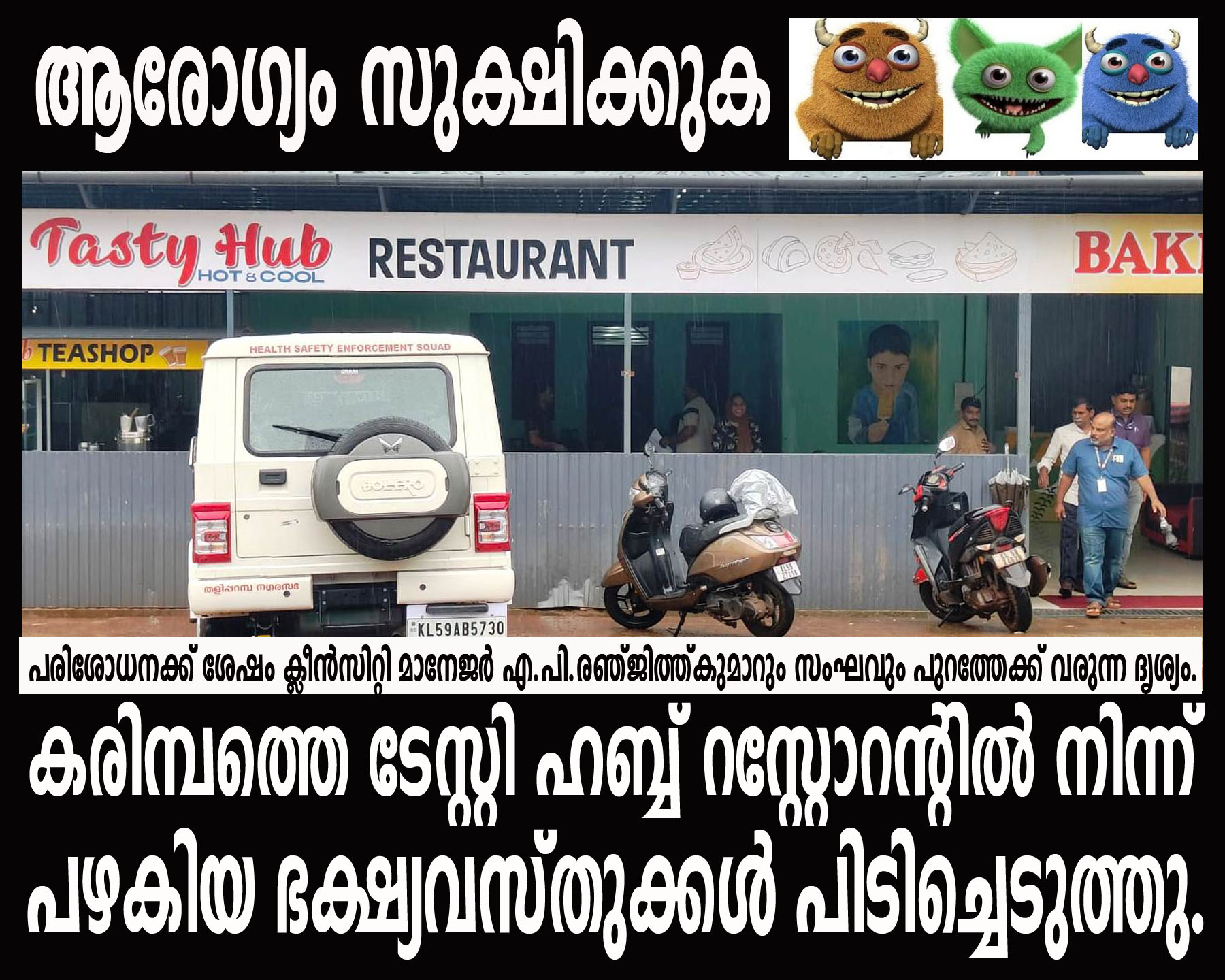 കരിമ്പം ബ്ലോക്ക് ഓഫീസിന് മുന്വശത്തെ ടേസ്റ്റി ഹബ്ബ് റസ്റ്റോറന്റില് നിന്ന് പഴകിയ ചോറ്, പഴകിയ മീന് വറുത്തത്, പഴകിയ കറികള് എന്നിവ പിടികൂടി.