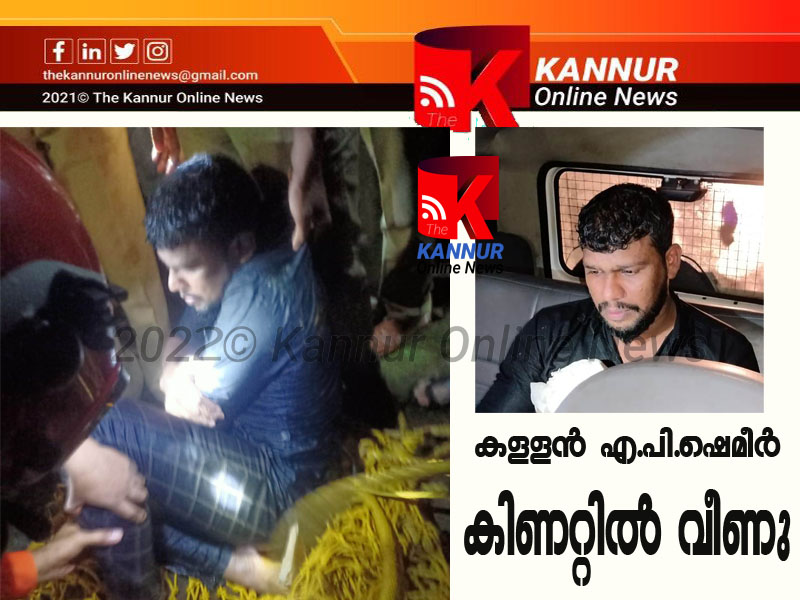 സംഭവം ഇങ്ങനെ–എരമം-കുറ്റൂര്‍ പഞ്ചായത്തിലെ തുമ്പത്തടത്തെ കേളോത്ത് പവിത്രന്‍ മാസ്റ്ററുടെ വീട്ടിലാണ് രാത്രി പത്തോടെ മോഷ്ടാവ് എത്തിയത്. സ്‌കൂട്ടറില്‍ വന്ന ഇയാള്‍ വാഹനം 20 അടി ദൂരെ കുറ്റിക്കാട്ടില്‍ ഒളിപ്പിച്ചുവെച്ചാണ് മോഷണത്തിനെത്തിയത്. പവിത്രന്‍ മാസ്റ്ററും ഭാര്യ രാജമ്മ ടീച്ചറും വീട് പൂട്ടി ഇന്നലെ ഉച്ചയോടെ തിരുവനന്തപുരത്തെ ബന്ധുവീട്ടിലേക്ക് പോയതായിരുന്നു. വീട്ടില്‍ ആളില്ലെന്ന് ഉറപ്പുവരുത്തിയ ശേഷമാണ് മോഷ്ടാവ് വീട്ടിലെത്തിയത്. കിണറിന്റെ ആള്‍മറയില്‍ കയറി പാരപ്പറ്റിലേക്ക് പിടിച്ച് വലിഞ്ഞുകയറാന്‍ ശ്രമിക്കുന്നതിനിടയില്‍ പാരപ്പറ്റില്‍ വെച്ച ഇഷ്ടിക അടര്‍ന്ന് കിണറ്റില്‍ വീഴുകയായിരുന്നു. ഷെമീറിന്റെ നിലവിളിയും ബഹളവും കേട്ടെത്തിയ നാട്ടുകാര്‍ പോലീസിനേയും അഗ്നിശമനസേനയേയും വിവരമറിയിക്കുകയായിരുന്നു. 30 അടിയോളം ആഴമുള്ള കിണറ്റില്‍ 4 അടി വെള്ളമുണ്ടായിരുന്നു. പെരിങ്ങോം അഗ്നിശമനനിലയത്തിലെ സീനിയര്‍ ഫയര്‍ ആന്റ് റെസ്‌ക്യൂ ഓഫീസര്‍ ബാബു ആയോടന്റെ നേതൃത്വത്തിലെത്തിയ സേനാംഗങ്ങള്‍ വല ഉപയോഗിച്ചാണ് മോഷ്ടാവിനെ കയയിലേക്ക് കയറ്റിയത്.