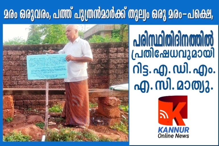 തളിപ്പറമ്പ്: മരം ഒരു വരം, പത്തുപുത്രന്മാര്ക്ക് തുല്യം ഒരു മരം–വര്ഷങ്ങളായി ഒരു അനുഷ്ഠാനം പോലെ കേട്ടുവരുന്ന പരിസ്ഥിതിദിന മുദ്രാവാക്യങ്ങളെ പരിഹസിച്ചും, മരങ്ങള് അനാവശ്യമായി മുറിച്ചുമാറ്റുന്നതിനെതിരെ ബോധവല്ക്കരണത്തിനുമായി പരിസ്ഥിതിദിനത്തില് വ്യത്യസ്ത പ്രതിഷേധവുമായി റിട്ട.എ.ഡി.എം എ.സി.മാത്യു.