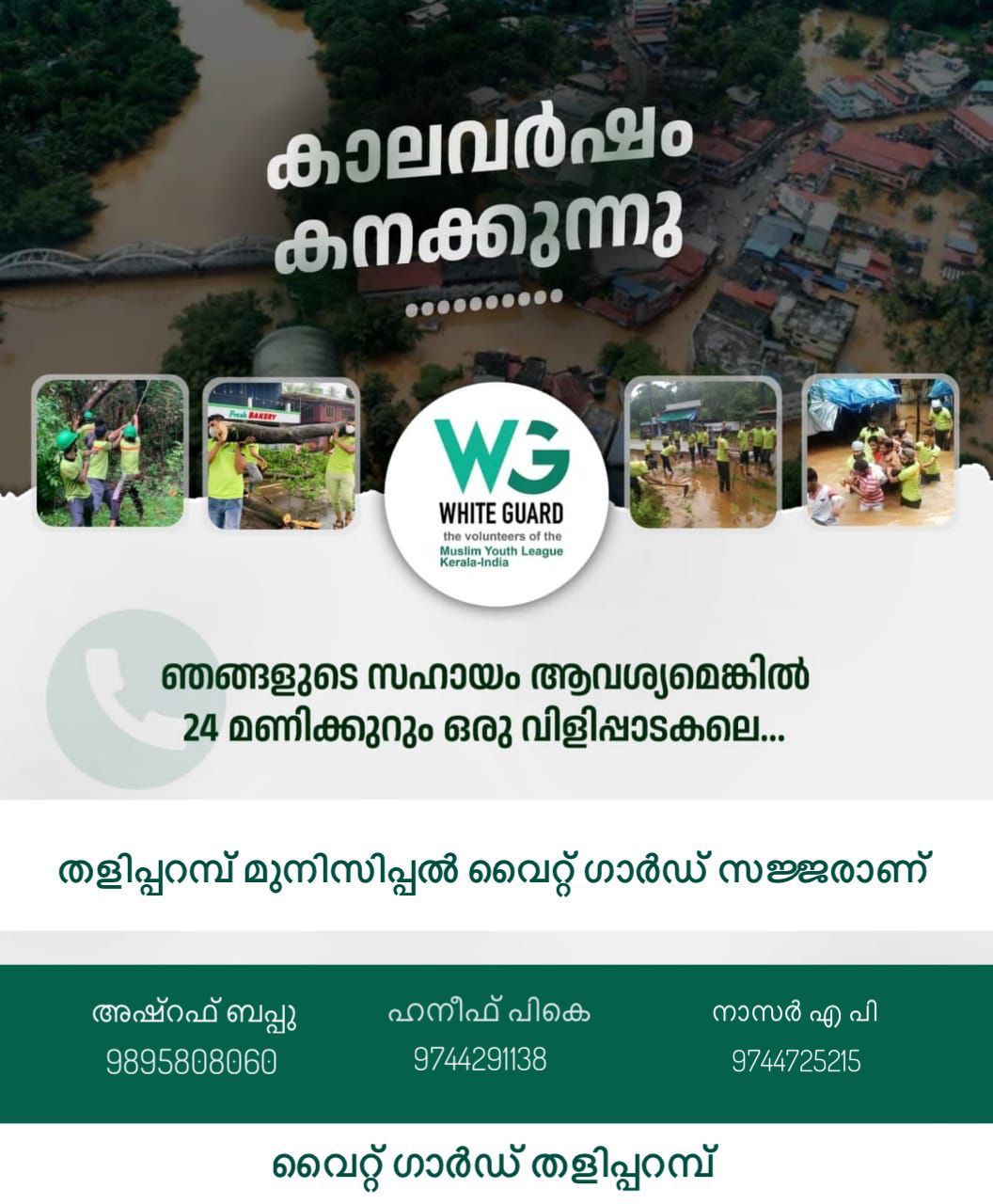 സഹായം ആവശ്യമുള്ളവര്ക്ക് യൂത്ത്ലീഗ് വൈറ്റ്ഗാര്ഡുകളുമായി ബന്ധപ്പെടാവുന്നതാണ്. ഫോണ്-